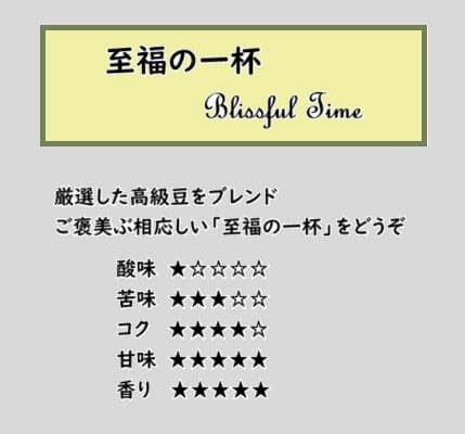 「至福の一杯」は、ご褒美タイムにぴったりな、特別な珈琲体験をお届けします。厳選した高級豆を使用し、香ばしさと深みのある味わいを引き出すために丁寧に焙煎されています。滑らかな口当たりと心を満たす風味で、贅沢なひと時をお楽しみいただけます。